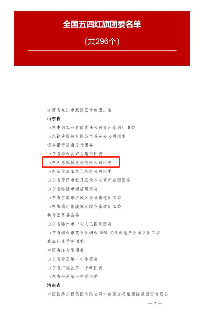 2023年是全面貫徹落實(shí)黨的二十大精神的開局之年。近日,共青團(tuán)中央作出表彰決定,授予296個(gè)團(tuán)組織全國五四紅旗團(tuán)委稱號(hào);授予389個(gè)團(tuán)組織全國五四紅旗團(tuán)支部稱號(hào);授予481名同志(含追授1名)全國優(yōu)秀共青團(tuán)員稱號(hào);授予342名同志全國優(yōu)秀共青團(tuán)干部稱號(hào)。山東天意機(jī)械股份有限公司團(tuán)委榮獲全國五四紅旗團(tuán)委榮譽(yù)稱號(hào)。