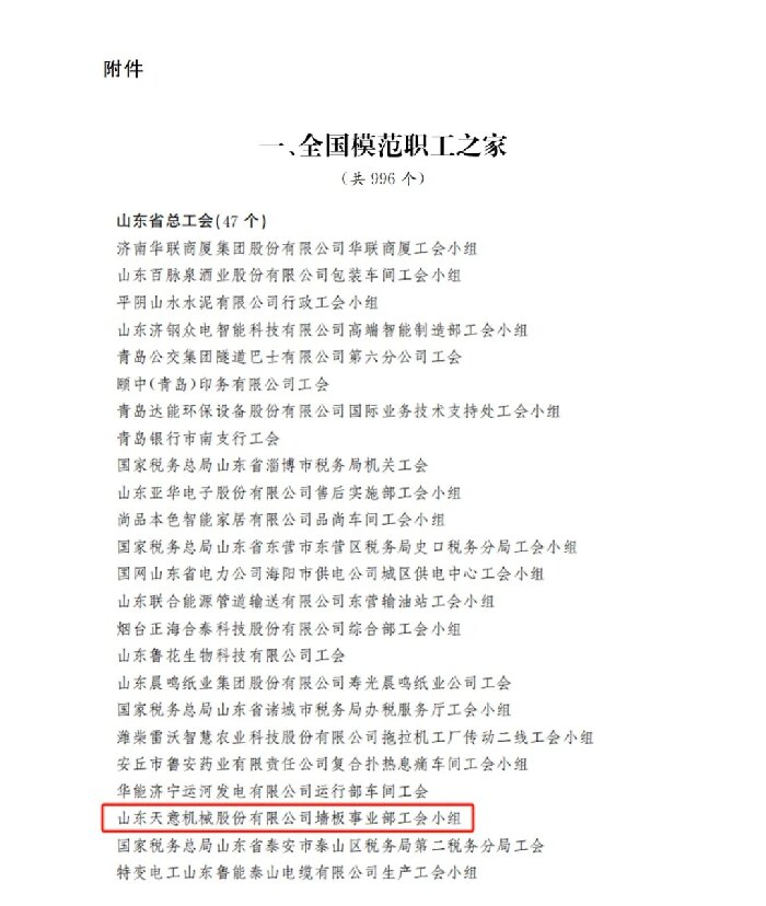 喜報丨天意機械墻板事業(yè)部工會小組獲評“全國模范職工小家”