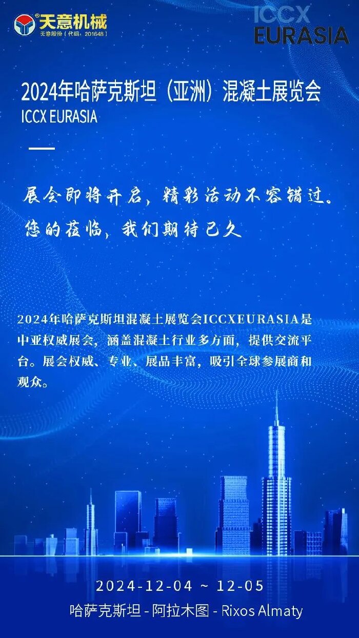 征程在即丨天意機(jī)械即將亮相2024年哈薩克斯坦混凝土展覽會 ICCX Eurasia